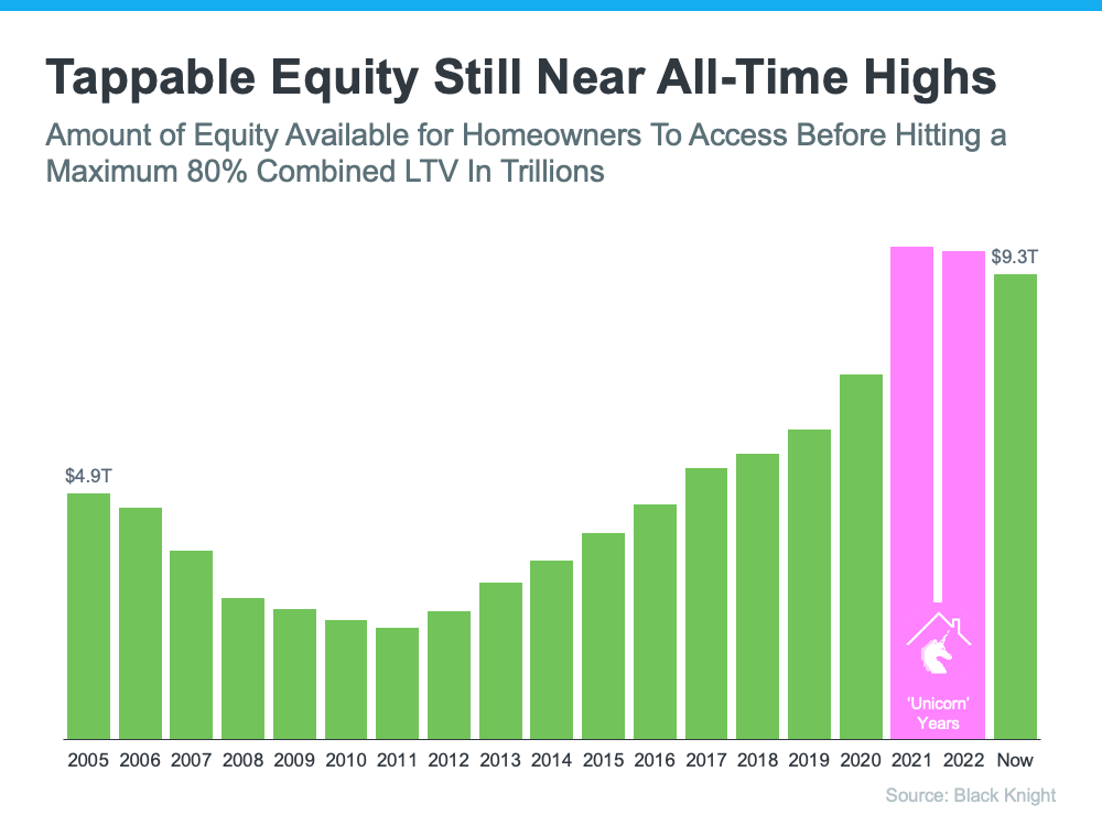 The graph below helps illustrate this point by looking at the total amount of tappable equity in this country going all the way back to 2005. Tappable equity is the amount of equity available for homeowners to access before hitting a maximum 80% loan-to-value ratio (LTV). As the data shows, there was a significant equity boost during the ‘unicorn’ years as home prices rapidly appreciated (see the pink in the graph below).