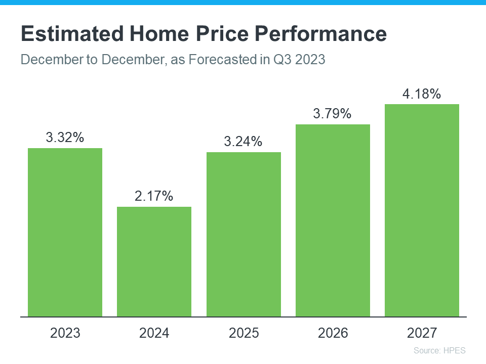 The Home Price Expectation Survey (HPES) from Pulsenomics is a great resource to show what experts forecast for home prices over a five-year period. It includes projections from over 100 economists, investment strategists, and housing market analysts. And the results from the latest quarterly release show home prices are expected to go up every year through 2027 (see graph below):