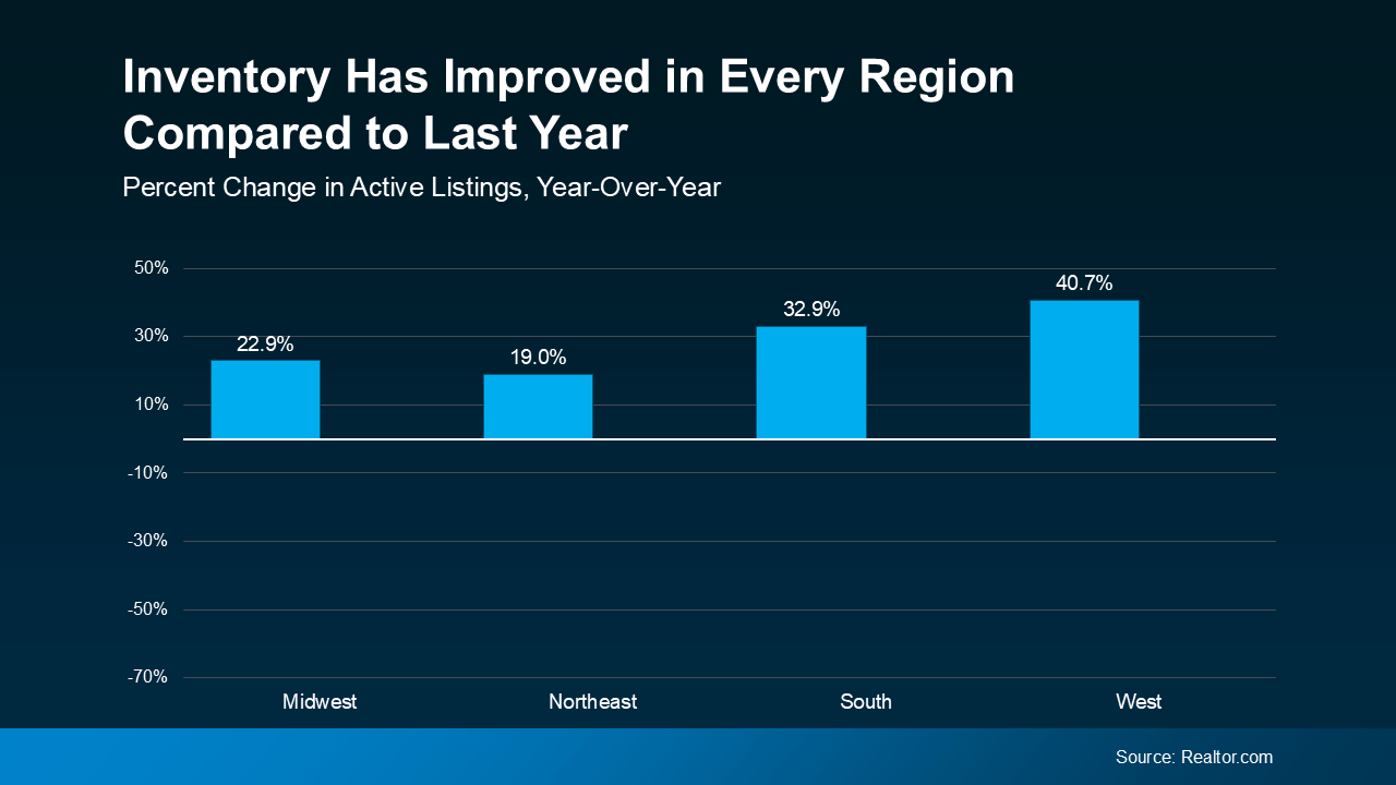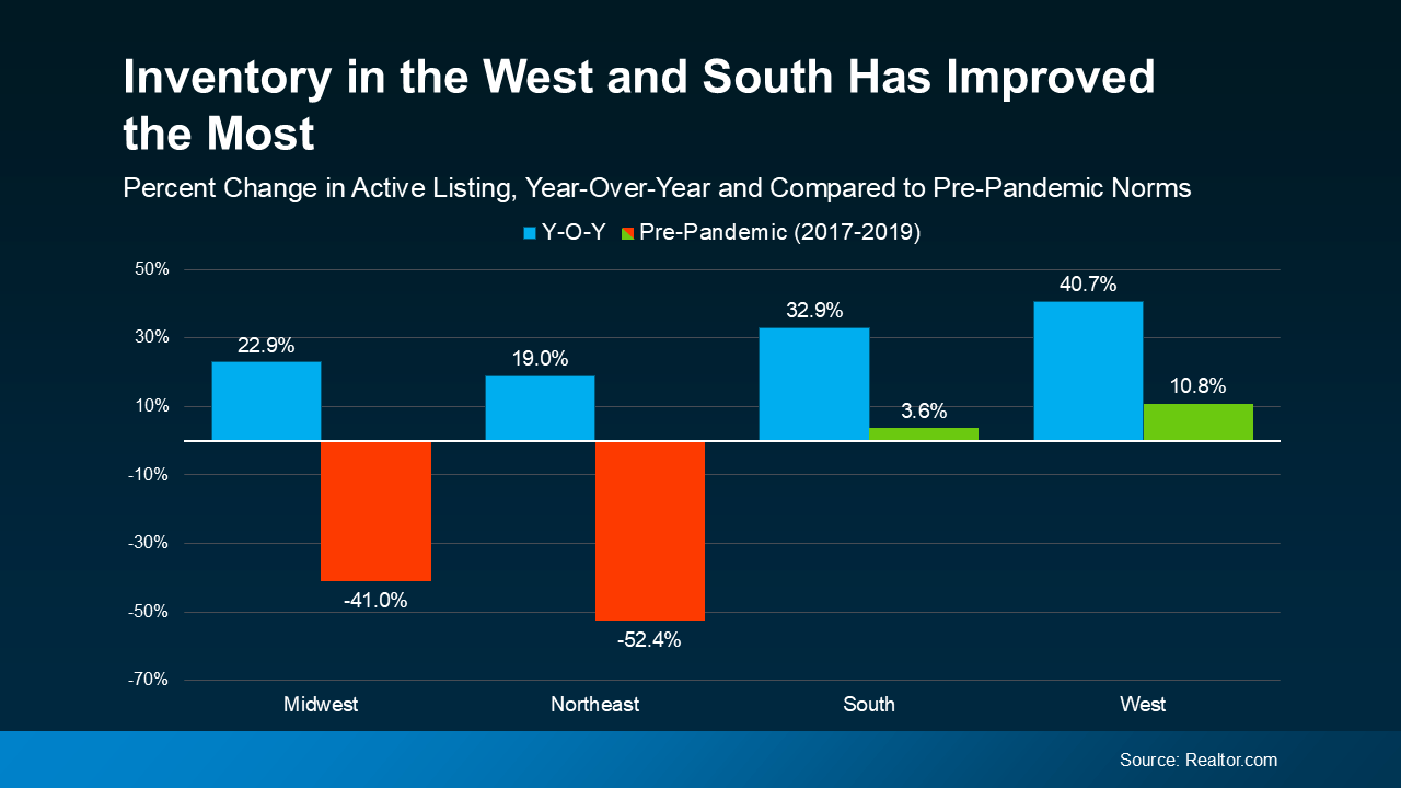 Nationally, the number of homes for sale is rising – and that’s true in all regions of the country. That’s shown in this data from Realtor.com. In each of the four regions, inventory is up at least 19% compared to the same time last year. In the West, it’s actually up almost 41% year-over-year (see graph below):