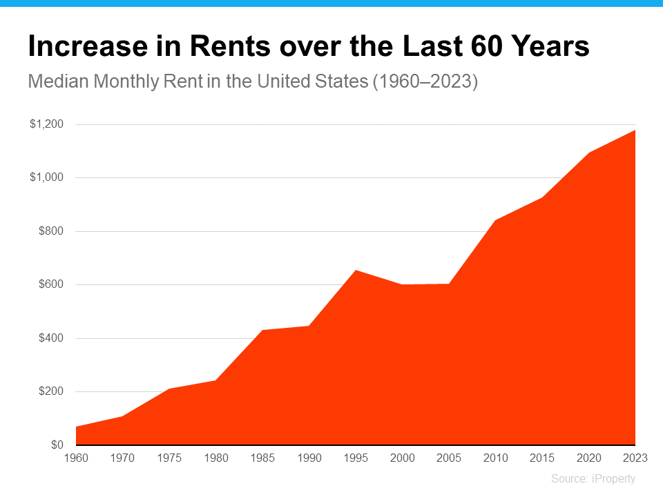 Here’s another reason you may want to think about buying a home instead of renting – rent just keeps going up over the years. Sure, it might be cheaper to rent right now in some areas, but every time you renew your lease or sign a new one, you’re likely to feel the squeeze of your rent getting higher. According to data from iProperty Management, rent has been going up pretty consistently for the last 60 years, too (see graph below):