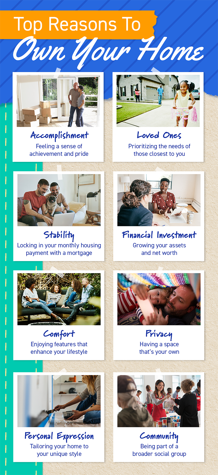 • If you’re considering homeownership, know that it can give you privacy, comfort, and a place to express yourself. It can also provide financial stability and help you grow your net worth.