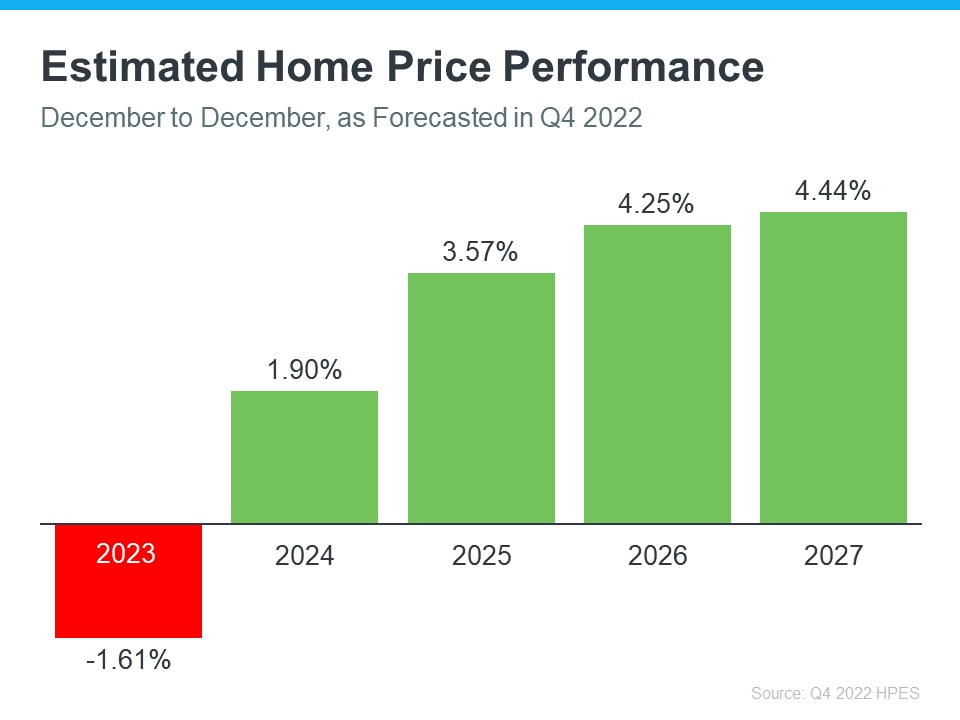 According to the Home Price Expectation Survey, which polls over 100 real estate experts, home values will go up steadily over the next few years after a slight decline this year (see graph below):