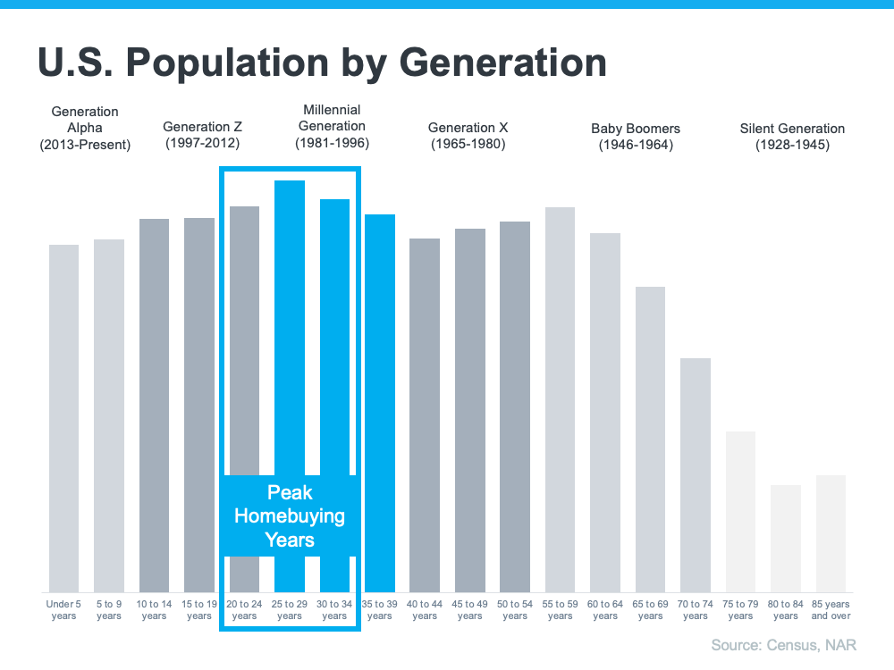 The frenzy the market saw during the pandemic is because there was more demand than homes for sale. That drove home prices up as buyers competed with one another for available homes. And while buyer demand has moderated today in response to higher mortgage rates, data tells us demand will continue to be driven by the large generation of millennials aging into their peak homebuying years (see graph below):