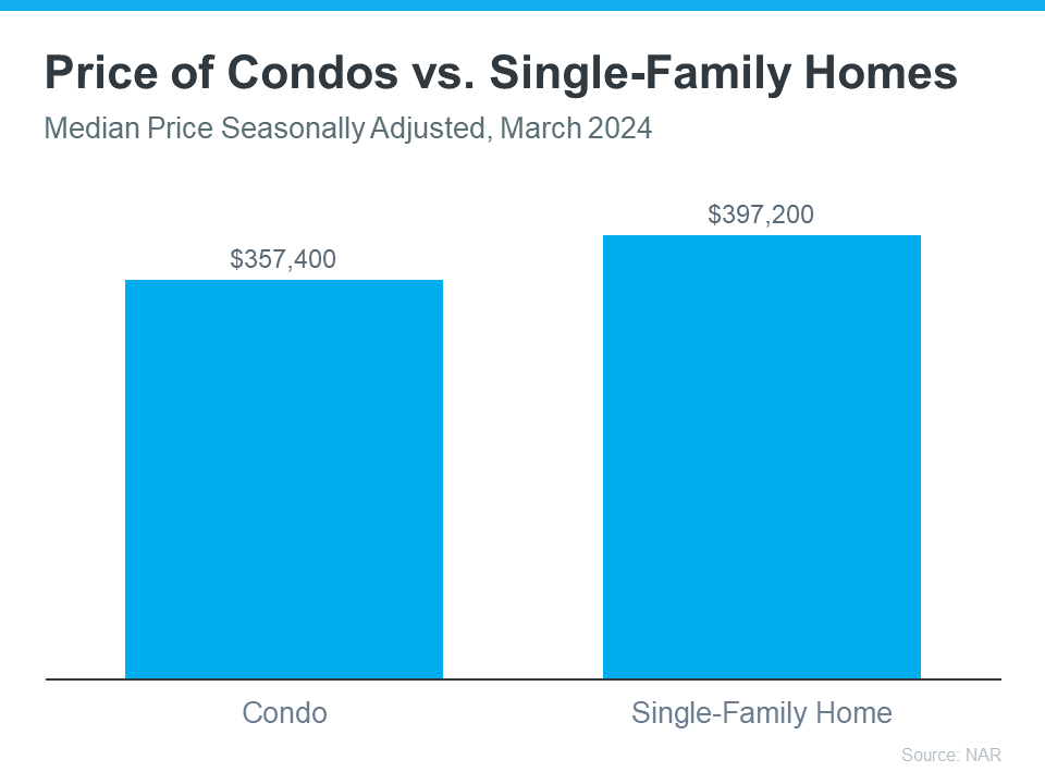 They’re usually smaller than single-family homes, but that’s exactly why they can be easier on your budget. According to the latest data from the National Association of Realtors (NAR), condos are typically less expensive than single-family homes (see graph below):