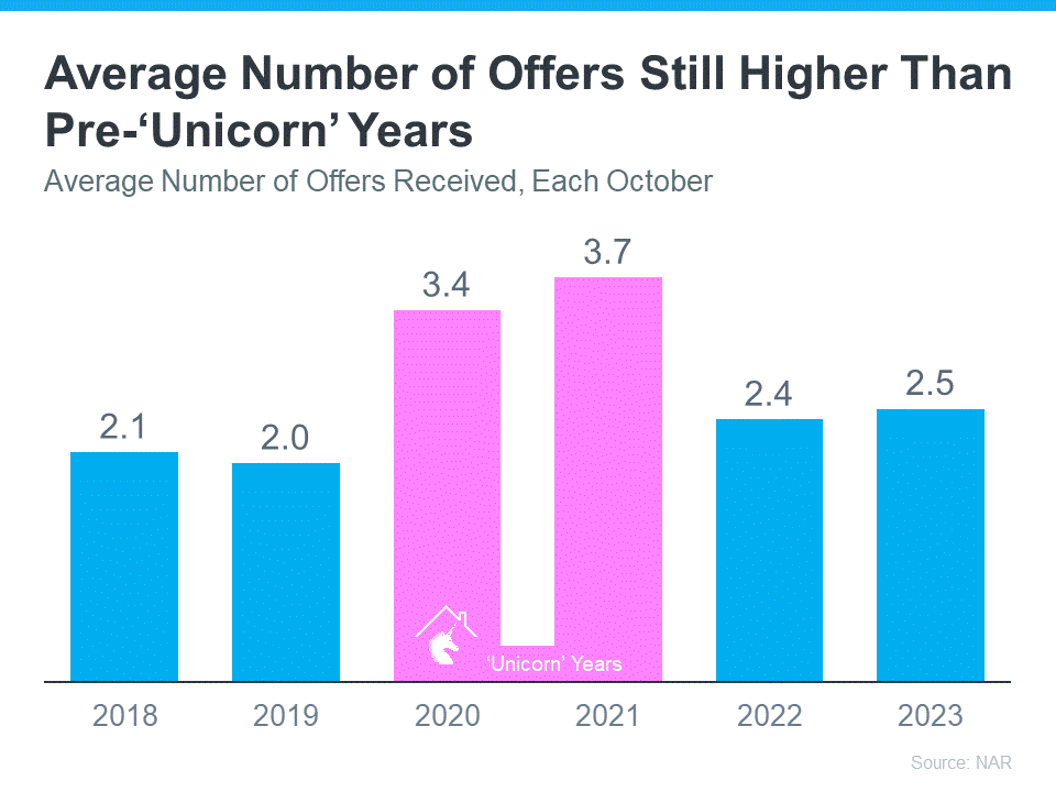In the graph, the ‘unicorn’ years are shown in pink. You can see demand has dipped some since then. That’s in response to higher mortgage rates. But, when you compare 2023 to the blue bars on the left that represent the last normal years in the market (2018-2019), you can tell buyers are still more active than the norm.